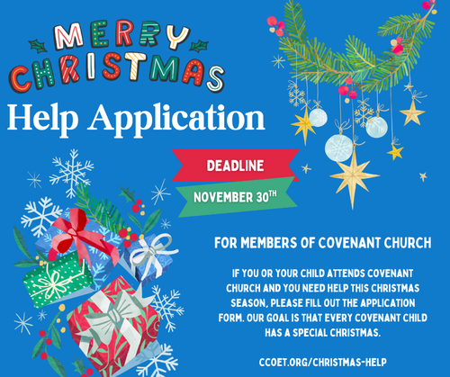 We want to help this holiday season be special for all the children/youth at Covenant Church. If you are a member of Covenant and are needing additional support this year please fill out the Christmas Help Application by November 30th. All submissions will need to received by this deadline in order to make purchases and arrangements for gifts to be picked up on Friday 12/05. We love you all and pray God's blessing be upon you this holiday season.