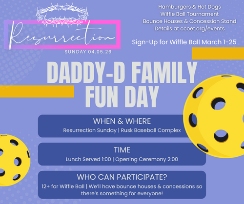 We're so excited for our Daddy-D Family Fun Day!! This event is held at the Rusk City Baseball Complex; we'll be serving hamburgers and hotdogs and then it's time for the annual Wiffle Ball Tournament! Lunch will be served starting at 1:00 and opening ceremony for the tournament starts at 2:00 - even if you're not interested in playing, come hang out and enjoy the fellowship! Sign-ups for Wiffle Ball are open March 1- 25. If you would like to coach please see Micah Edwards. Wiffle Ball is for ages 12 and up, however in addition to the tournament we'll have bounce houses and a concession stand so there is something for everyone - kids, teens, and grown-ups too! For questions or more information please see Dillon & Lauren Fowlkes or Micah Edwards.