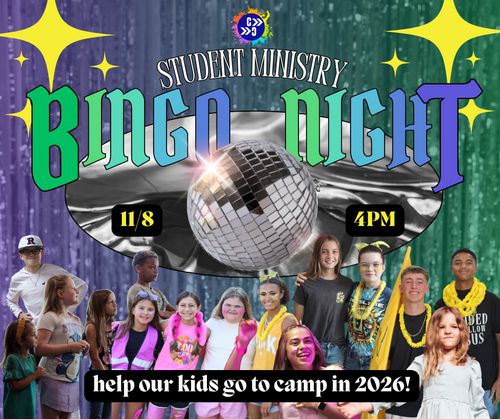 Our 3rd Bingo Fundraiser is almost here! Join us on November 8th for a night of fun! This fundraiser will go towards our Student Ministry to help with the cost of Summer Camp 2026 and is for all adults 18 and over. Tickets at our lowest prices are available now through November 7th! Tickets are $40 and include dinner. We will have concessions available $2.00 each for sodas, candy, and popcorn. Childcare is available for $3 per child for kids 11 years old and below. This year's theme is Disco, and we encourage everyone to participate by dressing up! It's going to be a BLAST!