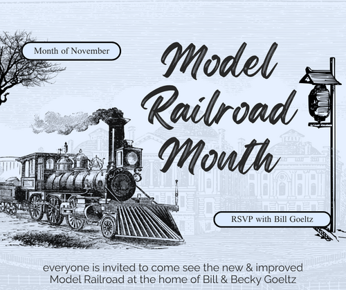 November is Model Railroad Month!! Bill and Becky Goeltz are inviting everyone to come out and see the new and improved model railroad! If you'd like to go check it out (which we can assure you that you do), please get with Bill to RSVP and schedule a time to visit. They would love to see you!