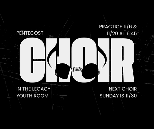 The Pentecost Choir led by Morgan Eddings, has upcoming practices on Thursday 11/6 & 11/20 starting at 6:45 in the Legacy Youth Room! Interested in joining the choir (choir Sunday is the 5th Sunday of any month)? This is the perfect opportunity for you to start singing with us! Come learn your part and practice with us in preparation for November 30th - we'd love to have you!