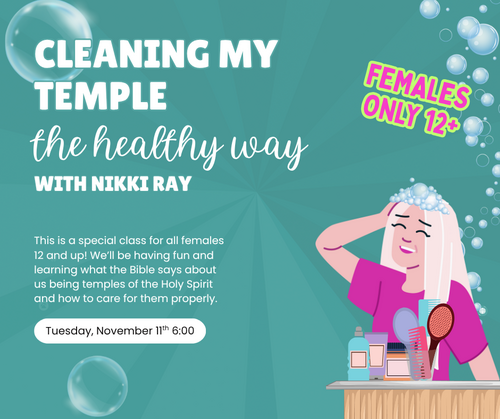 We have a great class that's coming up for females only 12+ that's going to be super fun to attend!! Cleaning My Temple The Healthy Way With Nikki Ray is a special, one night class on Tuesday, November 11th! This is part of our Tuesday HELP Night so there will be a free dinner served at 6:00 and at 6:30 we will disperse for class. Come join us for Biblical teaching covering how we are temples of the Holy Spirit. We're going to learn together how to care for our temples properly. All girls 12+ are encouraged to attend and this does include ladies!! We're going to laugh and learn together, so don't miss it!!
