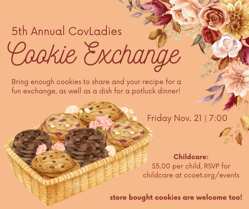 Join us for the super fun, Annual CovLadies Cookie Exchange! Bring your special cookies along with your recipe and enough to share with the group (typically about 2-3 dozen) and be part of exchanging cookies with your sisters! Also, bring a dish to share and we'll have a great dinner, cookies, fellowship and awards will be given for best cookie! Come spend time with a wonderful group of women and hear a special message. Store bought cookies are welcome! Just come and fellowship with us!! Childcare is provided for kids up to 11 for $5 per child, click Childcare to sign-up.