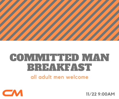 The Committed Man Breakfast is coming up on Saturday, November 22 at 9:00am and we'd love to have you join us! All adult men are invited to come hear Sr. Pastor Jan Pate deliver a special word from the Lord. Come get some great food and make a new connection with a brother in Christ!
