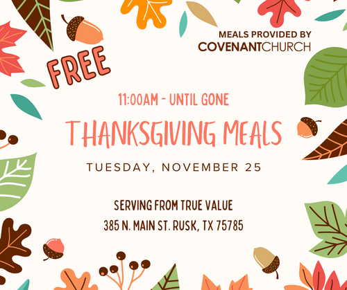 Mark your calendars for our Annual Feed the Community event where we will be providing free Thanksgiving meals for families, no questions asked. This will be held on Tuesday, November 25 at True Value in Rusk from 11:00 until all meals are gone (they do tend to go quickly). If you need to be blessed with a meal we want to help! Truly no questions asked, just come get whatever you need. We love this event and love having the opportunity to bless our community! God bless Rusk, Texas!