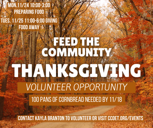 If you would like to help with our Annual Feed the Community event that provides free Thanksgiving meals to families we would love to have you! You can contact Kayla Branton directly or sign-up to volunteer right here. We will be working to prepare food on Monday 11/24 from 10:00-3:00 and then on Tuesday 11/25 passing the food out to families from 11:00-6:00 at True Value in Rusk. We also are needing 100 pans of cornbread by 11/18 and if you would like to bake some for this event you are welcome to bring it anytime to the church office on or before that deadline. Thank you to all of our volunteers and those who give throughout the year to make this annual event successful! We sure love blessing our community and couldn't do it without you all!